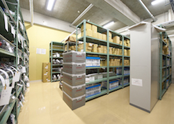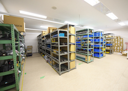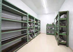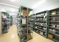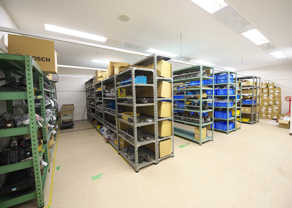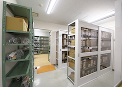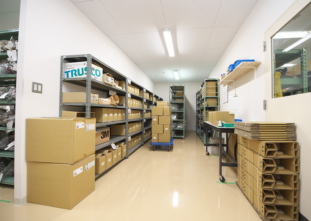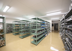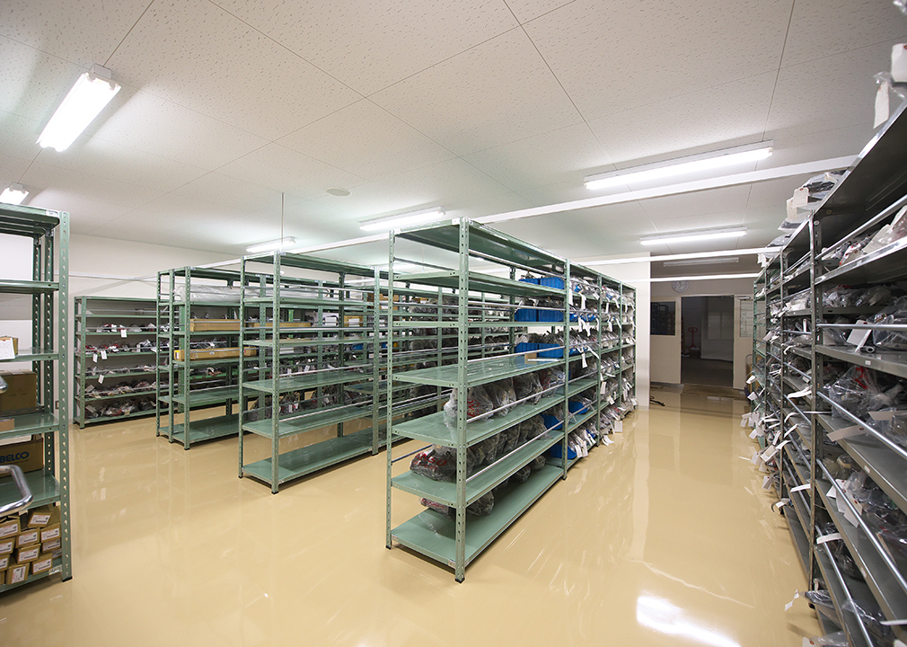 製品別、型式別等に見やすく整理し、在庫の管理と専用棚と耐震柵を設けて保管をしています。