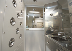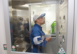 入室前にエアーブロー室で作業衣に付着する異物の除去します。